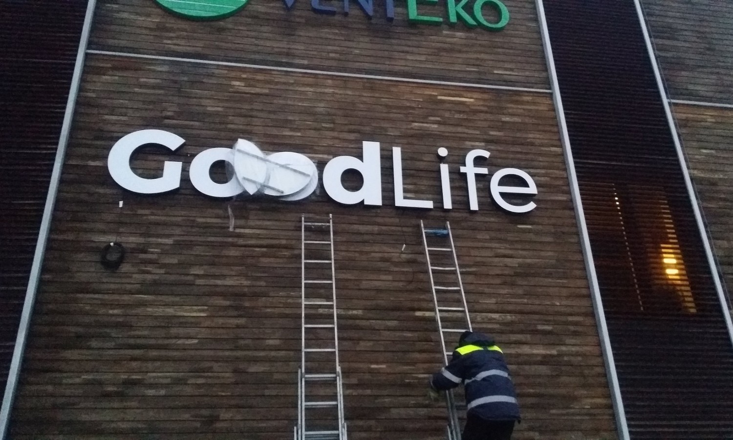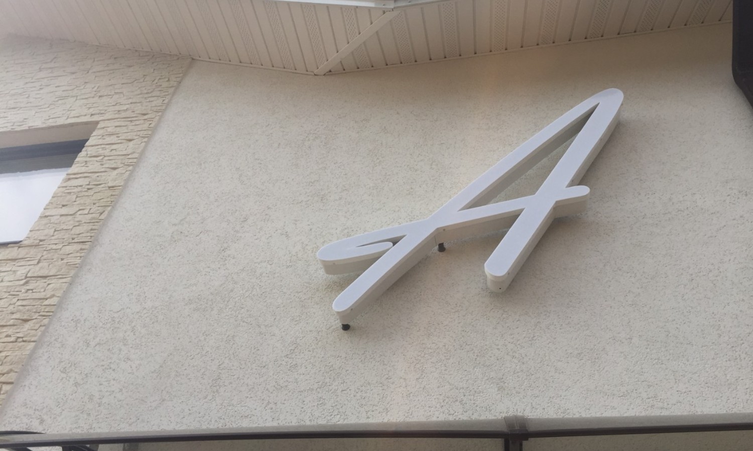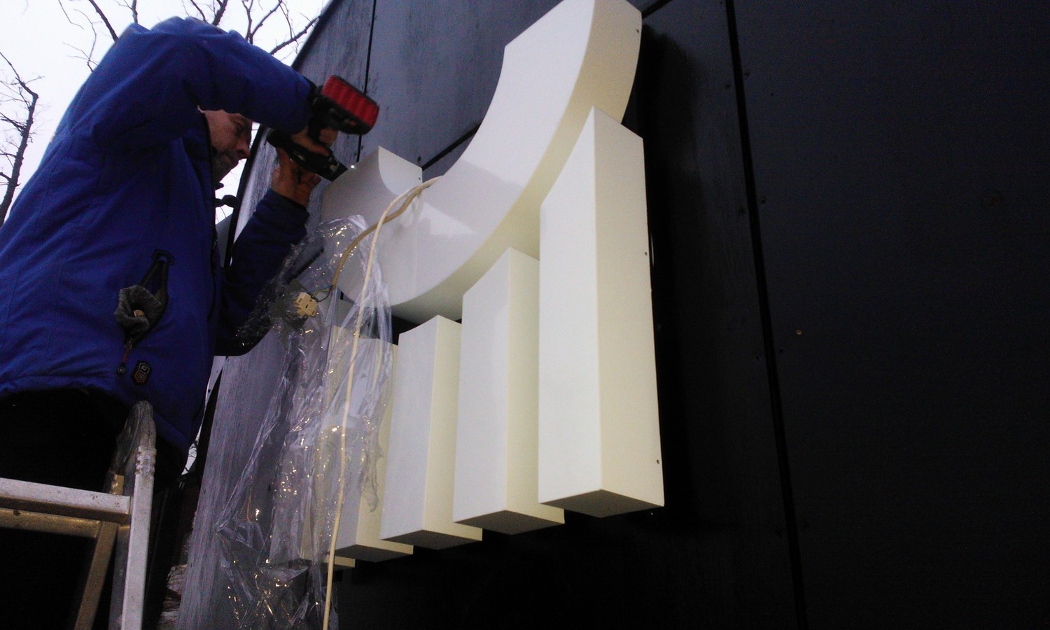 так как каждой букве необходимо подвести свой провод, а штробить фасад зачастую нет возможности, буквы и лого крепятся на направляющих окрашенных в цвет фасада. Как вариант, буквы могут крепиться на основании
