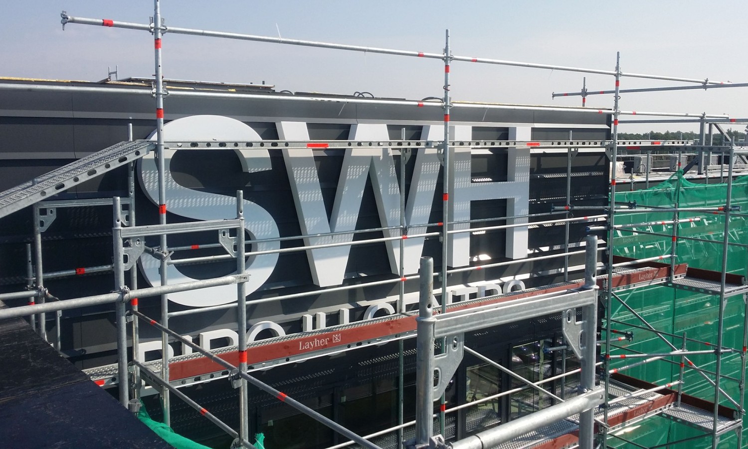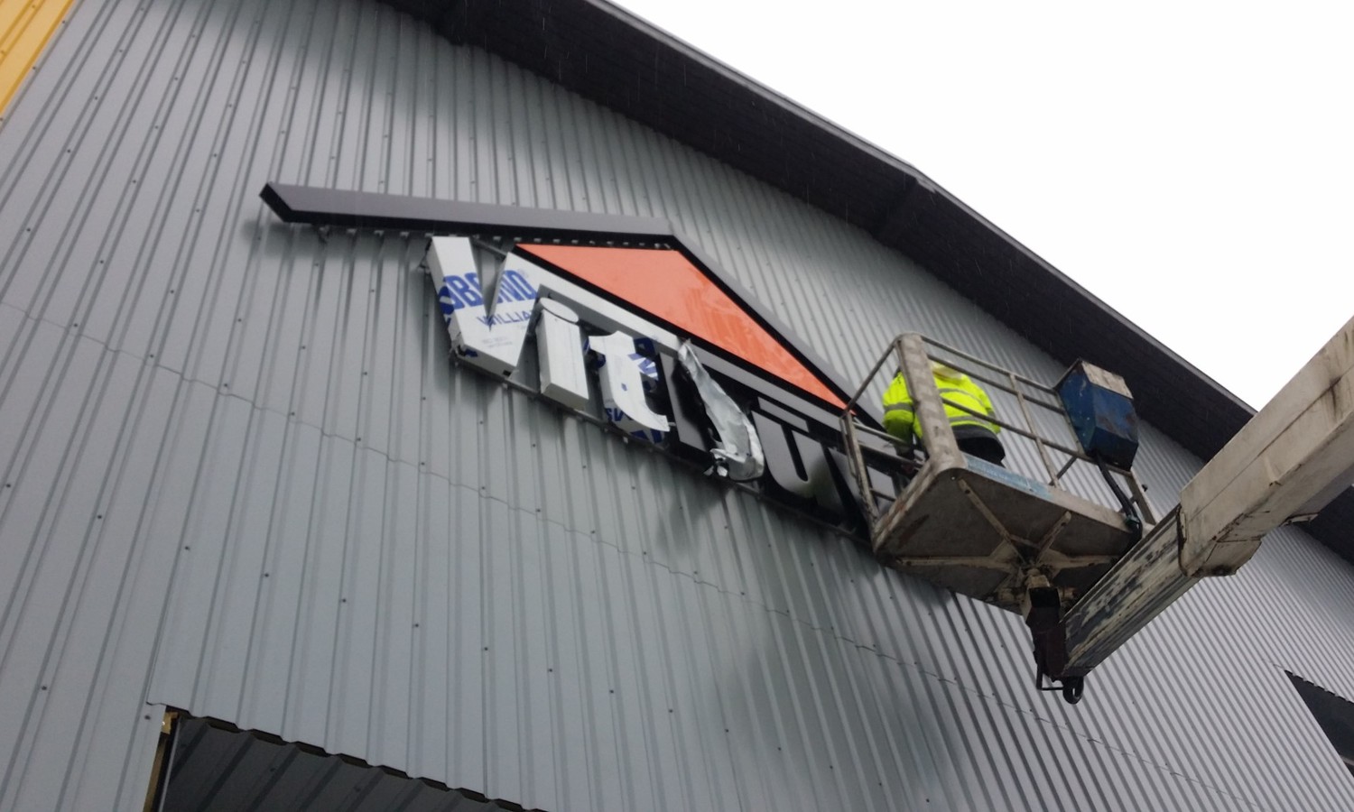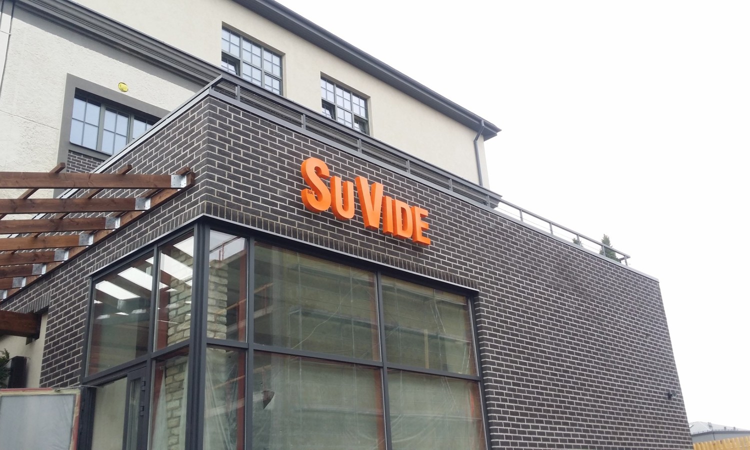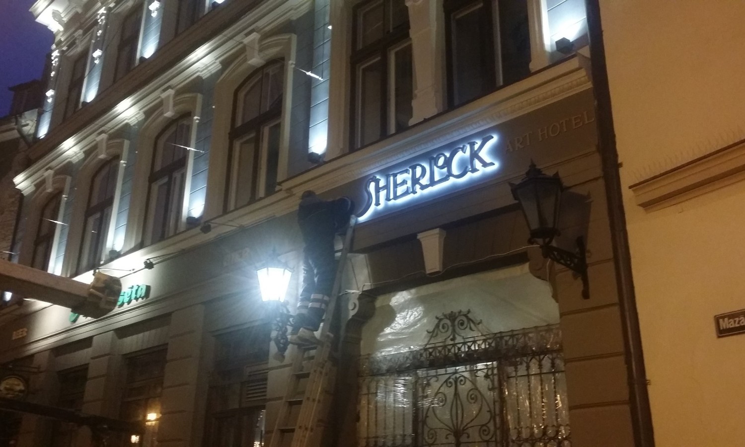 так как каждой букве необходимо подвести свой провод, а штробить фасад зачастую нет возможности, буквы и лого крепятся на направляющих окрашенных в цвет фасада. Как вариант, буквы могут крепиться на основании