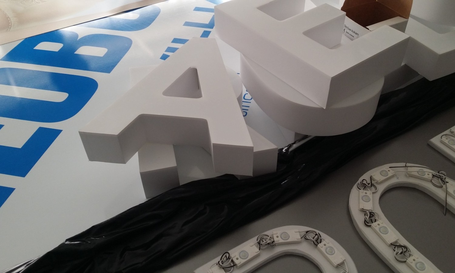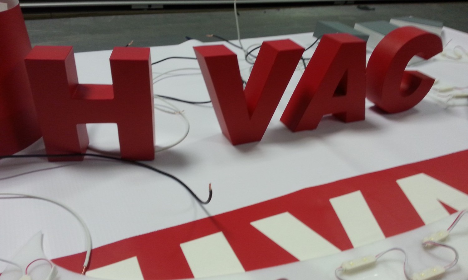 так как каждой букве необходимо подвести свой провод, то мы прокладываем проводку за стеной (гипсокартонной). На бетонных или штукатуренных стенах производим штробление стен с последующей шпаклевкой и покраской