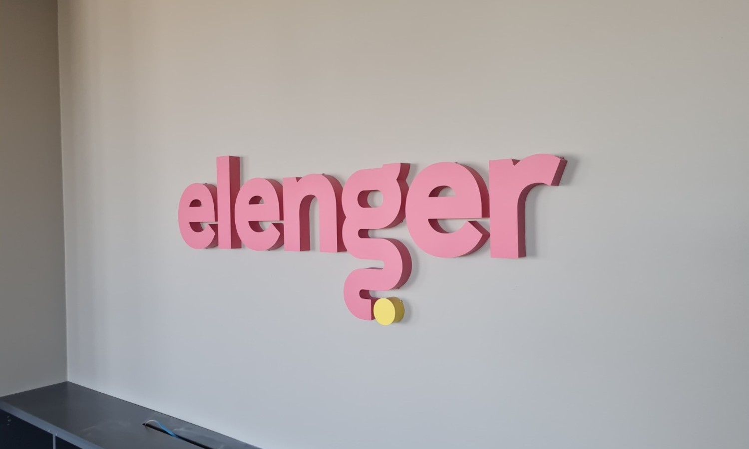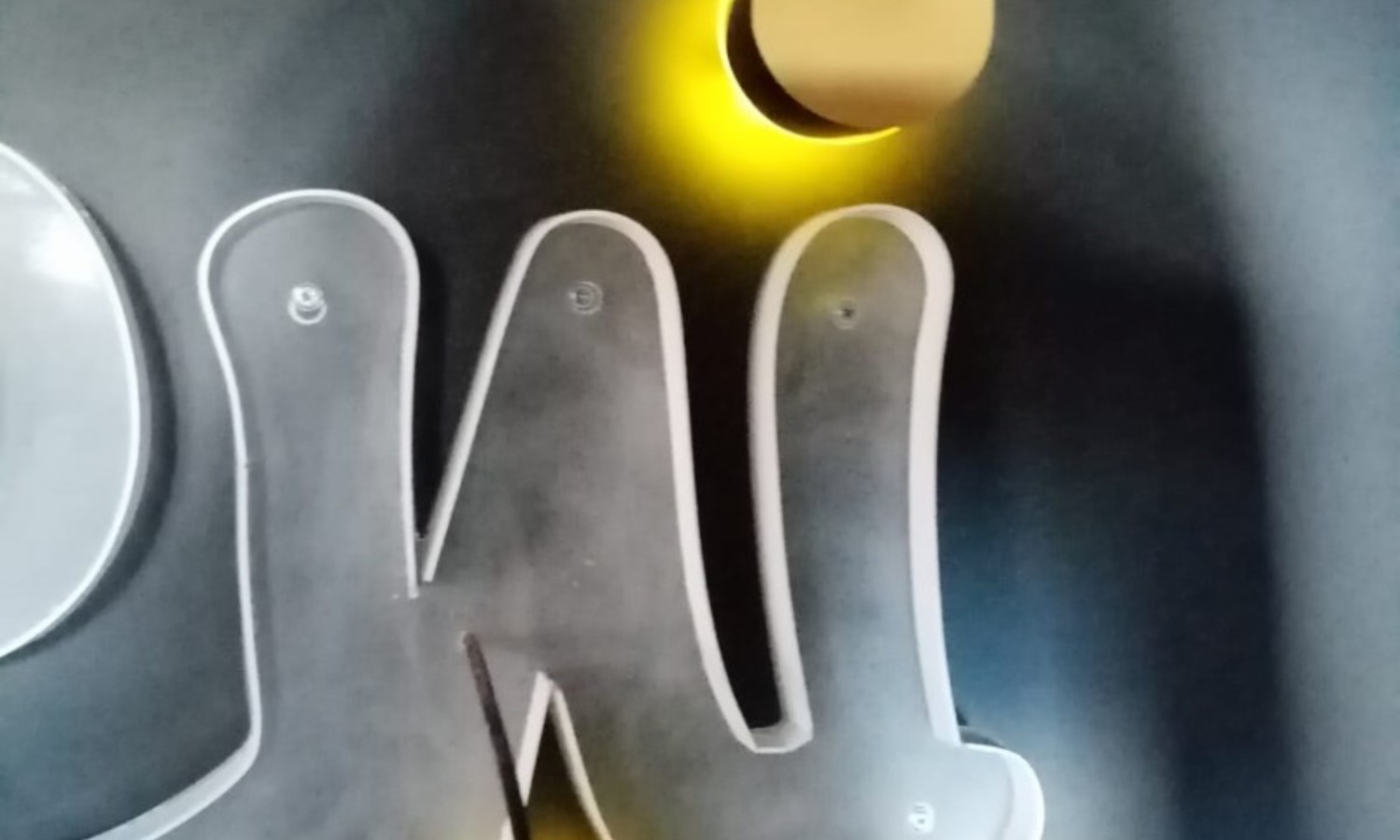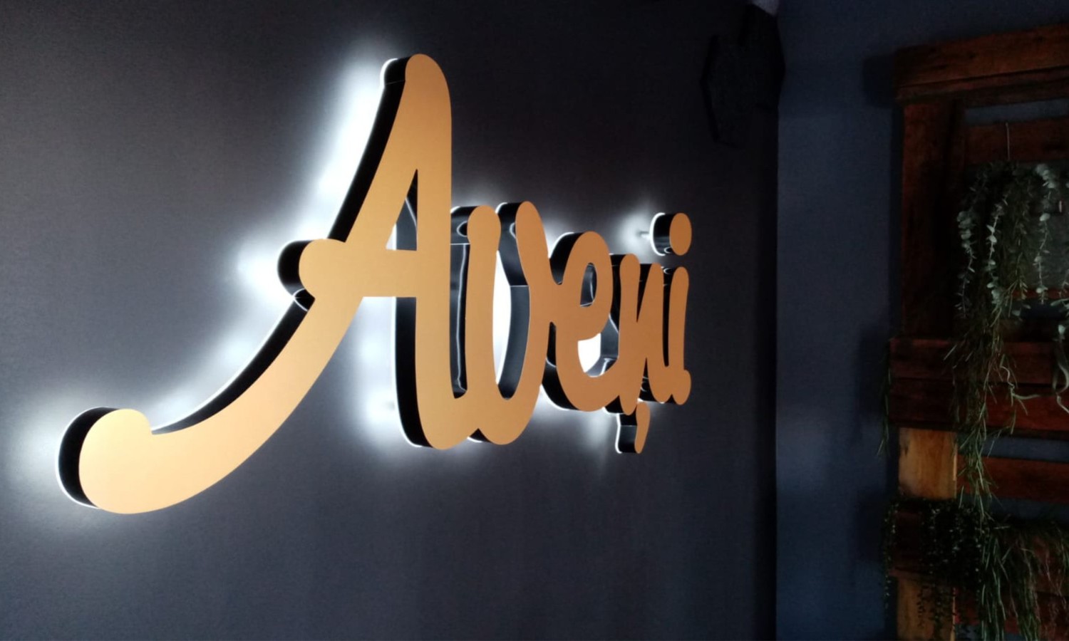 В случае, когда нет возможности установить и подключить логотип прямо на стену, буквы крепятся на основании, а подключается прямо к ближайшей розетке