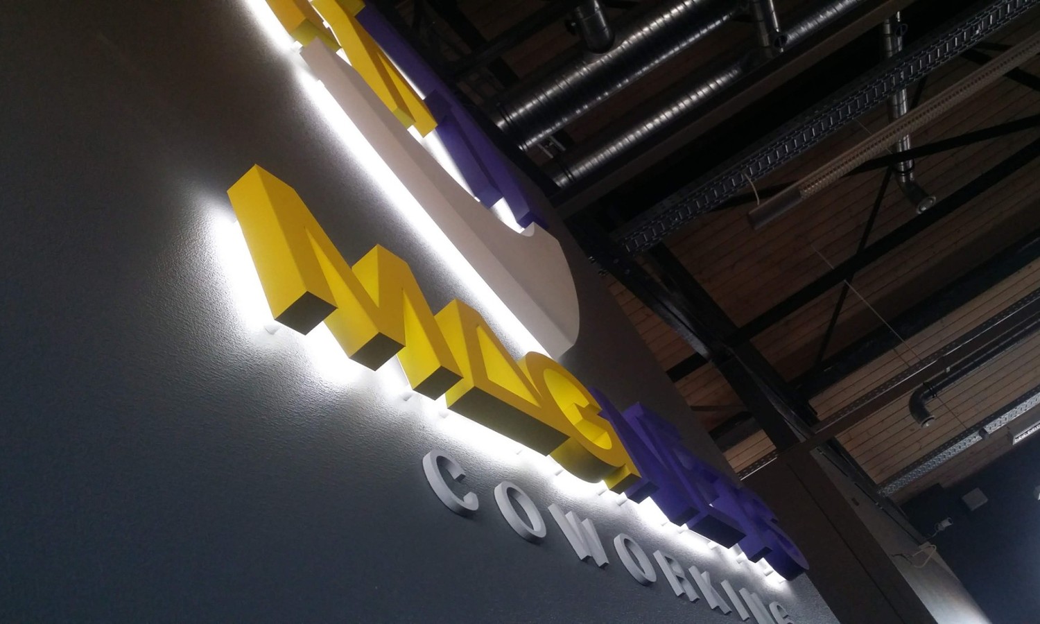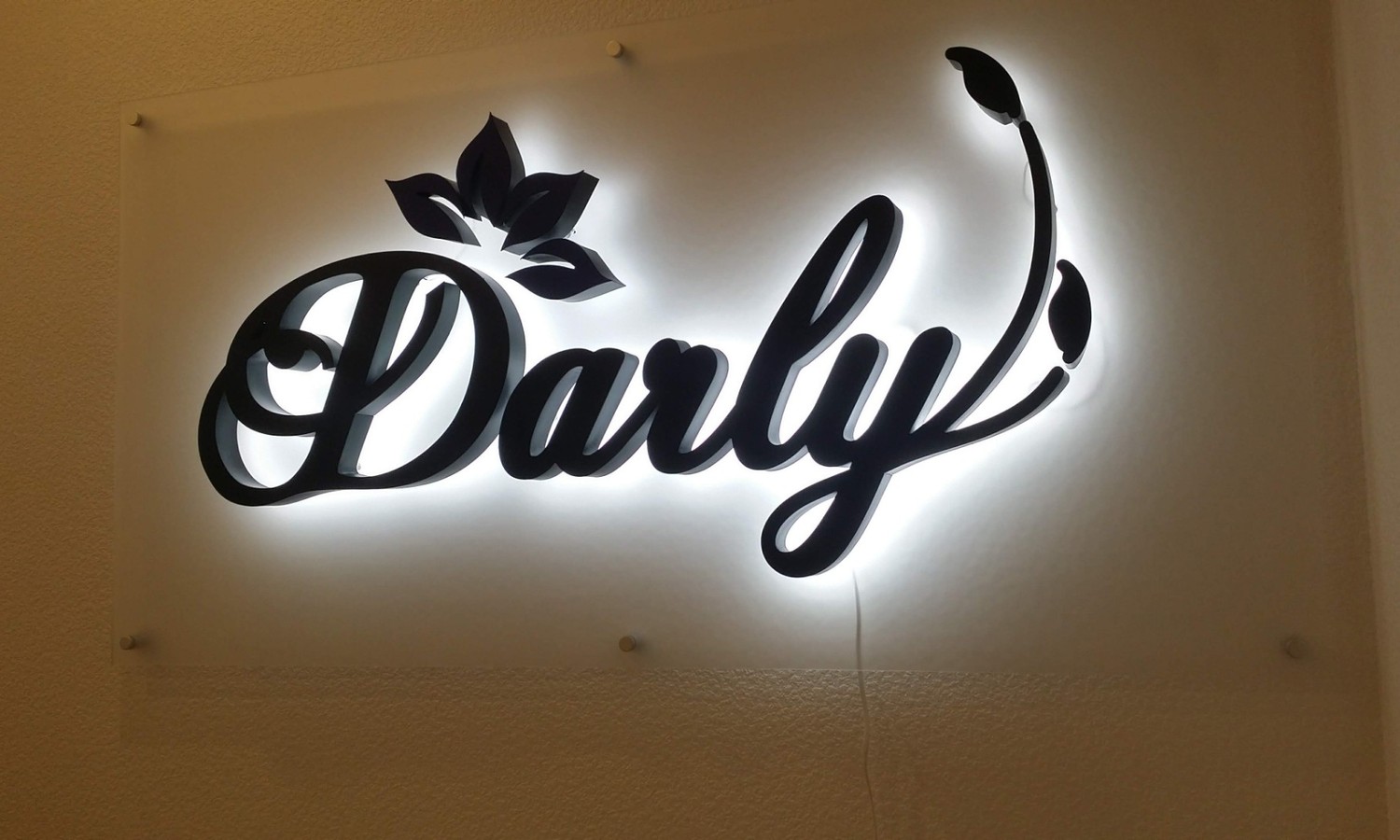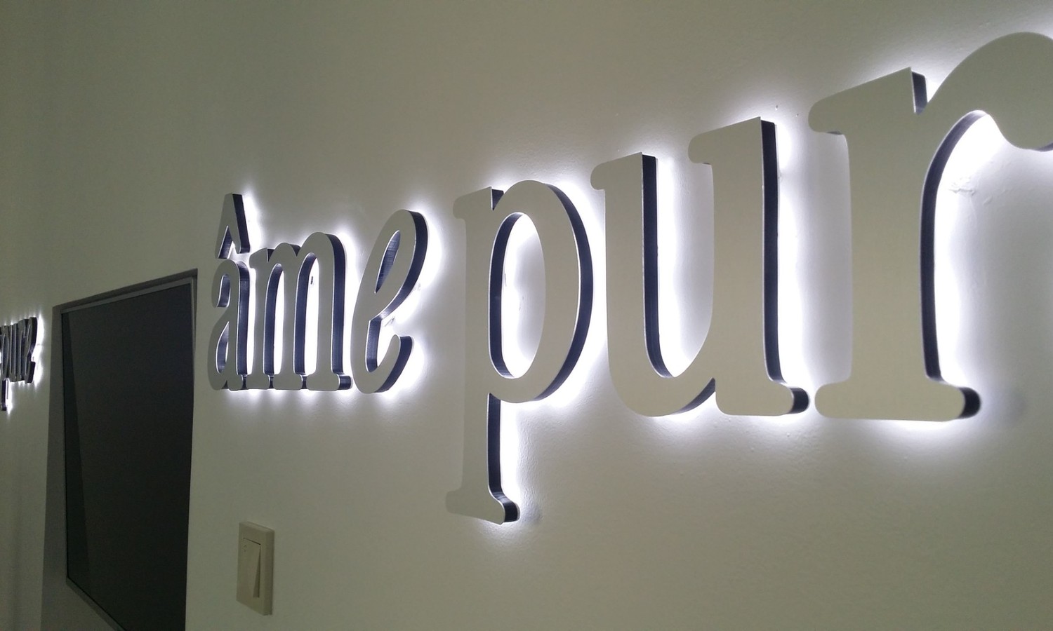 В случае, когда нет возможности установить и подключить логотип прямо на стену, буквы крепятся на основании, а подключается прямо к ближайшей розетке