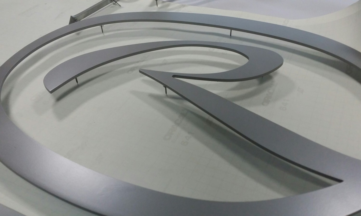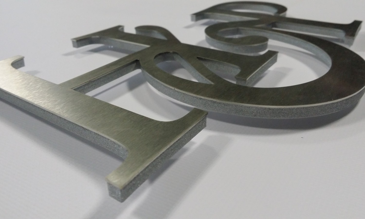 Для букв и элементов лого чаще всего метал берется от 1 до 5мм. Для придания контрастности и дополнительной толщины можно использовать подложку из черного или серого пластика 5-8мм толщиной.